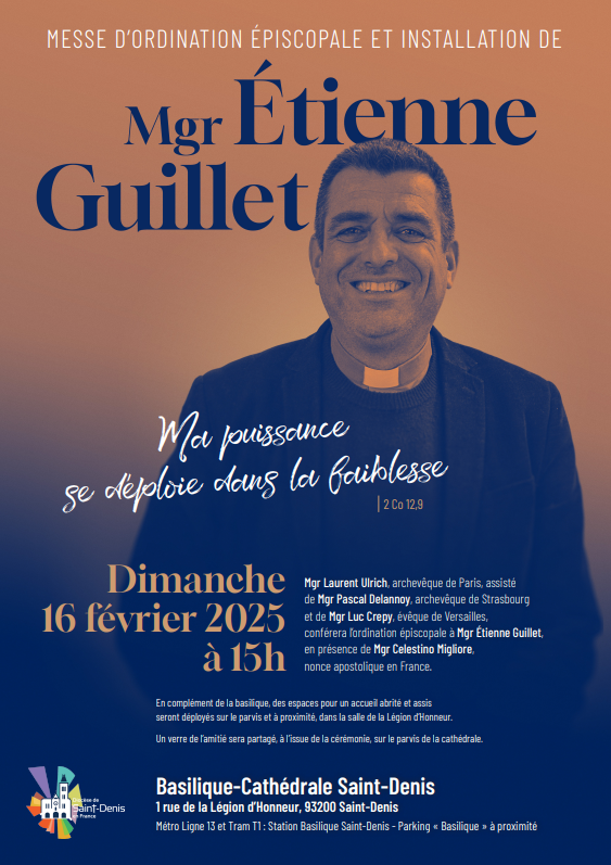 La messe d’ordination épiscopale de Mgr Étienne Guillet sera conférée par Mgr Laurent Ulrich, archevêque de Paris, assisté de Mgr Pascal Delannoy, archevêque de Strasbourg, et de Mgr Luc Crepy, évêque de Versailles, et en présence de Mgr Celestino Migliore,  nonce apostolique en France.