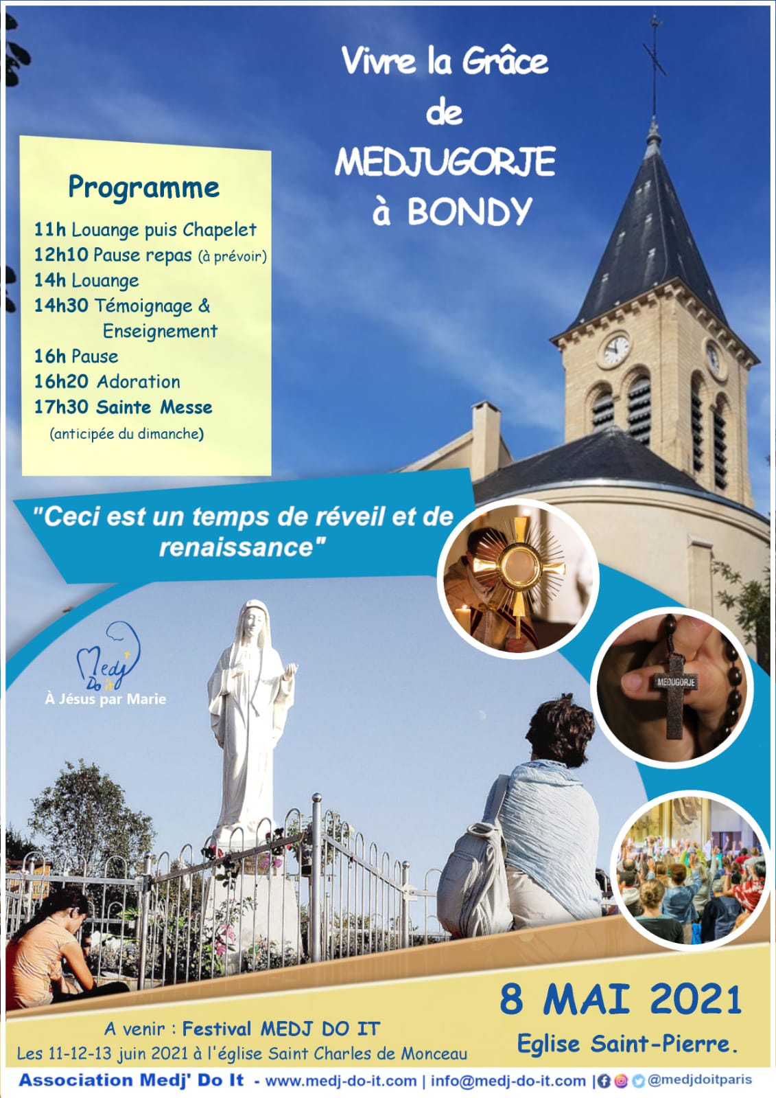 Samedi 8 mai, nous pourrons vivre la grâce de Medjugorje à Bondy puisque l’assocation Medj’Do It sera présente sur la paroisse Saint-Pierre.